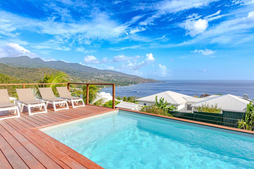 This upscale villa combines modernity and charm, ideally located on the heights of Malendure, with breathtaking views of the mountains and the sea. Tasteful, modern furnishings, with a magnificent L-shaped pool. Truly one of the most beautiful rentals in Guadeloupe!